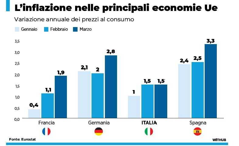 L’Italia, in questo contesto, è al momento messa meglio di altri partner. Secondo le stime preliminari dell’Istat, a marzo l’indice nazionale dei prezzi al consumo per l’intera collettività è salito all’1,7% dall’1,5% di febbraio, mentre l’indice armonizzato europeo è rimasto stabile all’1,5% su base annua. Anche l’aumento mensile della componente energia in Italia, pari al 4,9%, è inferiore alla media dell’area euro. E, sempre secondo l’Istat, su base annua i prezzi dell’energia