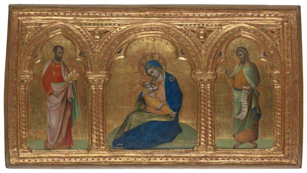 The tender look between mother and child lifts this medieval painting from gold-laden piety to human profundity. Mary is not so much humble as devoted to her baby. The infant too shows need for her. It’s a heart-wrenching moment of real life and recognisable experience. This Venetian work was painted at a time when Italian artists were pioneering a new sensitivity to gestures and expression, giving art unprecedented emotional power. The cooler, more distant and regal figures of early medieval art were giving way to psychological acuteness and passionate drama. Veneziano shares this new mentality with artists such as Giotto and Simone Martini – and writers like Dante, Boccaccio and Britain’s Geoffrey Chaucer.